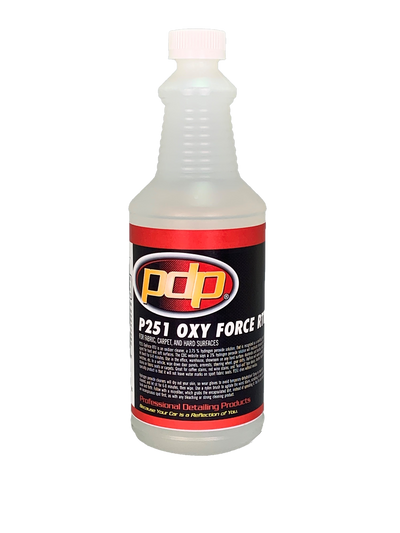 P251 OxyForce RTU is an oxidizer cleaner, a 3.75 % hydrogen peroxide solution, that is recognized as a sanitizing bleaching agent for hard and soft surfaces. The CDC website says a 3% hydrogen peroxide solution will inactivate rhinovirus when you let dwell for 6-8 minutes. Use in the office, warehouse, showroom on any hard surface: doorknobs and handles, railings, light switches, etc. In a vehicle, wipe down door panels, armrests, steering wheel, gear shifts. Oxyforce will work on hard to clean stains on fabric seats or carpets. Great for coffee stains, red wine stains, and "kool-aid" type stains. Another feature of this specialty product is that it will not leave water marks on sport fabric seats. P251 dries without residue.